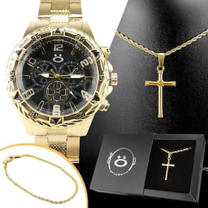 O kit também inclui um colar com pingente de cruz, conferindo um toque de fé e significado à joia. Além disso, uma pulseira dourada completa o conjunto, adicionando um charme adicional ao visual.