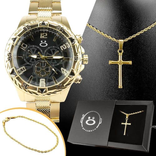 Surpreenda aquela pessoa especial com este incrível kit O destaque principal é o relógio analógico dourado, com fundo preto banhado aço inox e um toque exclusivo de estilo spaceman. Fabricado em aço inoxidável, o relógio não apenas proporciona facilidade na visualização das horas, mas também acrescenta um toque de sofisticação ao pulso de quem o utiliza.