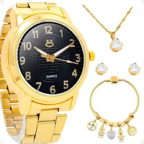 Relogio banhado aço inox feminino + pulseira + colar brinco qualidade premium dourado social casual Kit Feminino Orizom Maria - Luxo, Elegância e Exclusividade em Um Só Conjunto