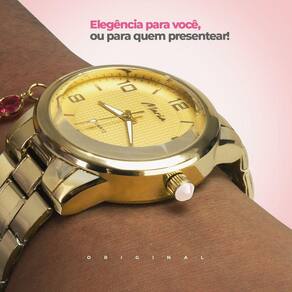 Características: - Relógio Orizom Maria: - Design dourado elegante - Caixa em aço inox banhado - Mostrador analógico para um toque clássico - Diâmetro aproximado de 4cm