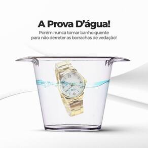 - Relógio analógico feminino dourado banhado a 18k, à prova d'água e feito em aço inoxidável, proporcionando estilo e durabilidade para o uso diário. - Colar banhado com pingente em strass transparente, acrescentando um toque de elegância e brilho sutil ao visual. - Par de brincos banhados com pedrinha de strass transparente, oferecendo um complemento delicado e sofisticado para qualquer ocasião. - Pulseira banhada com vários strass transparentes, adicionando um toque de brilho e glamour ao conjunto.