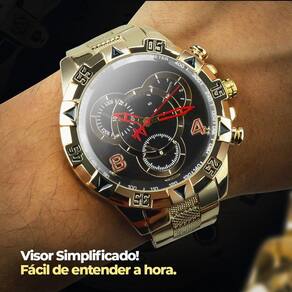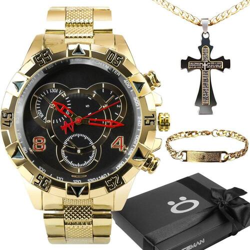Kit Luxuoso Masculino Dourado - Relógio, Corrente, Pulseira e Caixa PremiumSeja o centro das atenções com este kit luxuoso e deslumbrante! O relógio masculino dourado à prova d'água em aço inoxidável é a combinação perfeita entre beleza e funcionalidade, ideal para uso diário e feito com materiais de alta qualidade.A corrente banhada a ouro 18k em aço inoxidável com pingente de cruz e oração do Pai Nosso é a peça perfeita para quem deseja expressar sua fé com elegância e estilo. Com 60 cm de comprimento, é um acessório sofisticado e significativo.A pulseira grumet dourada em aço inoxidável com placa e oração do Pai Nosso complementa o conjunto de maneira impecável, adicionando um toque pessoal ao seu visual para qualquer ocasião.E para completar, o kit é apresentado em uma caixa ultra premium, tornando-o o presente perfeito para aquele alguém especial. Valorize seu estilo e surpreenda com este conjunto impressionante, cheio de requinte e sofisticação!