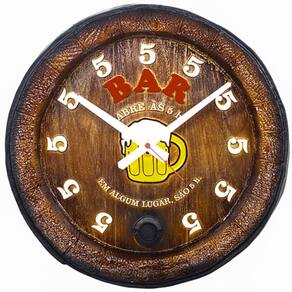 Relógio Barril decorativo BAR. Seu miolo com os dizeres: BAR abre às 5h - Em algum lugar são 5h - e tem seus marcadores apenas com os números 5, além do caneco de Chopp amarelo no meio. O Relógio Barril decorativo é confeccionado em fibra de vidro, simula de forma realista a tampa de um barril de madeira de carvalho com um relógio. Uma peça funcional e muito bonita. Ideal para decoração de bares, churrasqueiras, espaço Gourmet, salão de festas e decoração em casa. Tem o diâmetro de 42 cm de diâmetro por 7 de altura. Essa peça é para ser pendurada na parede. Produzida artesanalmente, uma a uma é pintada nos mínimos detalhes à mão com tintas de alta qualidade e cores vibrante. Máquina do relógio com a qualidade Quatz. O resultado é um presente de indiscutível qualidade e único ideal para homens. Peça colecionável e decorativa. Decore com estilo e bom gosto ambientes como estúdios, barzinhos, restaurantes, salas e churrasqueiras. É um verdadeiro presente para ser lembrado! Ean: 7898574060413
