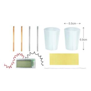contém relógio digital com f105, potes, fio para conexão, fitas transparentes, tiras de cobre e de zinco e instruções detalhadas.