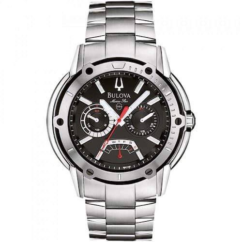 Bulova Marine Star WB31069T, relógio analógico masculino com caixa e pulseira de aço inoxidável prata, vidro de cristal mineral, 47.7 mm de diåmetro e pesando 194 g. Alimentação a bateria e com resistência de 10 atm.