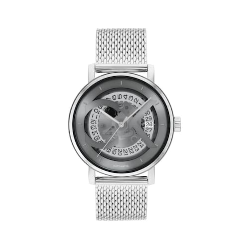 - Materiais de qualidade: caixa automática de aço inoxidável de 40 mm e pulseira de malha com mostrador cinza.