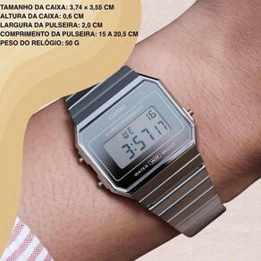 Ficha Técnica Marca: Casio Modelo: A700WEV-7A Mecanismo: Digital Material da Caixa: Resina cromada Material da Moldura: Resina/cromado Material da Pulseira: Aço inoxidável com fecho ajustável Resistência à Água: Sim (uso diário) Tipo de Vidro: Mineral Formato: Retangular Gênero: Unissex Estilo: Vintage / Casual Funções: Cronômetro 1/100 s, Alarme diário, Sinalização horária, Luz LED laranja, Calendário automático, Formato 12/24h Precisão: ±30 segundos por mês Fonte de Energia: Bateria CR1616 Autonomia: Aproximadamente 3 anos