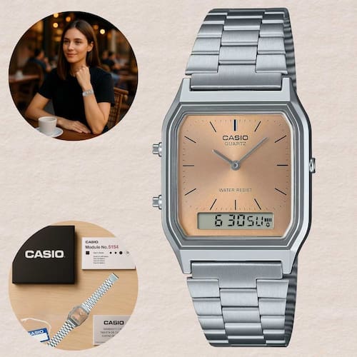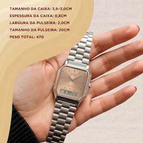 O Casio AQ-230A une o charme do design vintage com a praticidade da tecnologia Anadigi, trazendo o melhor dos dois mundos em um visual clássico e sofisticado. Com pulseira de aço inoxidável e caixa cromada, ele é perfeito para quem busca um acessório elegante para o dia a dia sem abrir mão da funcionalidade. Sua tela digital, localizada na posição das 6 horas, oferece hora dual, cronômetro e alarme diário, ideais para manter sua rotina organizada. Além disso, conta com resistência à água de 3 ATM, oferecendo segurança em situações do cotidiano. Um relógio que combina estilo retrô com praticidade moderna.