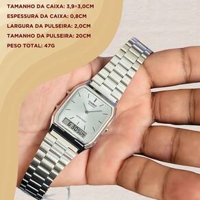 Ficha Técnica: Marca: Casio Modelo: AQ-230A Movimento: Anadigi (Analógico + Digital) Material da Caixa: Resina / Cromado Material da Pulseira: Aço Inoxidável Resistência à água: 3 ATM (30m) Formato: Retangular Gênero: Unissex Estilo: Casual / Vintage Diâmetro da caixa: 3,9 x 3,0 cm Espessura: 0,8 cm Largura da pulseira: 2,0 cm Comprimento da pulseira: 20 cm Peso: 47g