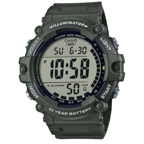 Outros: Repetição automática - Alarme/sinal de hora em hora - 5 alarmes multifuncionais (com 1 alarme soneca) - Luz de fundo LED Afterglow - Cor clara / LED: Âmbar - Calendário automático completo (até o ano 2099) - Precisão: ± 30 segundos por mês - Formato de 12/24 horas - Horário regular: Hora, minuto, segundo, pm, mês, data, diaar - Vidro de resina - Tamanho da caixa (L× W× H): 54,4 × 51,3 × 15,8 milímetros - Peso: 61g - Material da caixa / moldura: Resina - Pulseira em resina - Resistência à água: 100 metros de resistência à água - Fonte de alimentação e vida útil da bateria - Vida útil da bateria: 10 anos no CR2032 (aproximadamente)