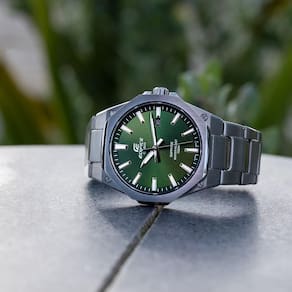 O mostrador verde possui leitura clara e refinada, protegido por cristal de safira com revestimento antirreflexo, proporcionando alta resistência a riscos e ótima visibilidade. O relógio conta ainda com resistência à água de até 100 metros, ideal para o uso cotidiano e atividades aquáticas leves.