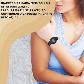 Ficha Técnica Marca: Casio Modelo: F-105W-1ADF Movimento: Digital Material da Caixa: Resina Material da Pulseira: Silicone Resistência à água: 3 ATM Formato: Retangular Gênero: Unissex Estilo: Esportivo Retrô Diâmetro da caixa (cm): 3,9 x 3,5 Espessura (cm): 1,0 Largura da pulseira (cm): 1,6 Comprimento da pulseira (cm): 19 Peso (g): 21