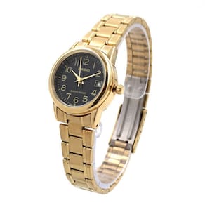 Características Formato do Relógio: Redondo Composição do Vidro: Cristal mineral Material da Caixa: Metal Cor da Caixa: Dourado Cor do mostrador: Preto Material da Pulseira: Aço Inox Cor da Pulseira: Dourado Mecanismo: Analógico Quartz