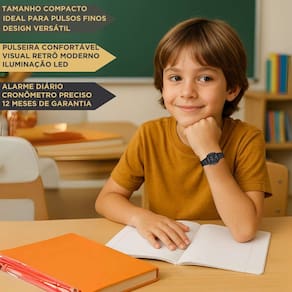 Com um estilo divertido e toque retrô, o relógio Casio Infantil Digital LA-20WH é perfeito para crianças que buscam praticidade e personalidade no dia a dia. Extremamente leve e confortável, pesa apenas 16 g, trazendo bem-estar no uso prolongado. Sua pulseira em resina resistente garante durabilidade, enquanto o visor digital iluminado por luz LED laranja facilita a leitura em qualquer ambiente, inclusive à noite. O modelo oferece funções essenciais como cronômetro, calendário automático, formatos 12/24h e alarme diário, unindo diversão e funcionalidade. Com resistência à água de até 30 metros, é ideal para o uso cotidiano sem preocupações, acompanhando o ritmo ativo das crianças com charme e segurança.