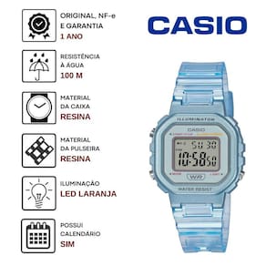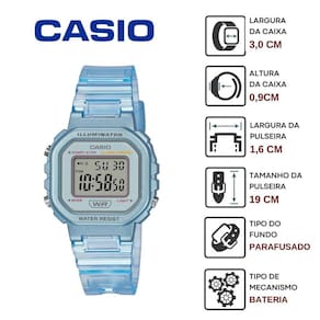 Relógio Casio Infantil Digital Azul LA-20WHS-2ADFExpresse seus lados ousados e sutis com uma combinação brilhante de caixa metálica e pulseira translúcida. Este relógio digital oferece um ajuste leve e confortável e todas as funções que você precisa, incluindo luz LED, cronômetro, calendário e alarme. A resistência à água para uso diário libera você de preocupações, mesmo quando pego na chuva. EspecificaçõesMaterial da caixa: resinaPulseira de resinaResistente à águaAproximadamente. vida útil da bateria: 5 anos em CR1616vidro de resinaRecursosCronômetro de 1/100 de segundo Capacidade de medição: 5959,99" Modos de medição: Tempo decorrido, tempo intermediário, tempos do 1º ao 2º lugaralarme diárioSinal horárioLuz LEDLED: ÂmbarCalendário automático (calendário automático definido em 28 dias para fevereiro)Precisão: ±30 segundos por mêsFormato de 12/24 horasHorário regular: hora, minuto, segundo, pm, data, dia Medidas:Diâmetro da caixa: 3,4 x 3,0 cmEspessura da caixa: 0,9cmLargura da pulseira: 1,6cmTamanho da pulseira: 17cmPeso do relógio: 16g Conteúdo da Embalagem:Estojo da MarcaAcessórios (correspondentes a cada modelo)Manual em PortuguêsCertificado de 01 ano junto ao FabricanteNota Fiscal Eletrônica Fornecedor: Casio Brasil Comércio Produtos Eletrônicos Ltda. CNPJ:10.172.255/0001-95