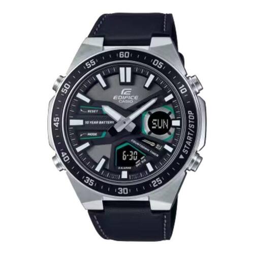marca: casio modelo: efv-620l-1avudf tipo de relógio: analógico gênero: masculino estilo: casual calendário: sim cronômetro: sim alarme: não luz: não - ponteiros e marcadores fluorescentes resistência à água: sim - 10 atm = 100 metros tipo de fecho: fivela simples material da caixa: aço inoxidável material da pulseira: couro características do vidro: vidro mineral tamanho da caixa c l a : 55 50. 5 11. 8 mm peso do produto: 94 gramas cor da pulseira: preto cor da caixa: prateado alimentação: bateria conteúdo da embalagem: relógio, caixa, , certificado de garantia e manual de instruções garantia do fabricante: 12 meses fabricante: casio