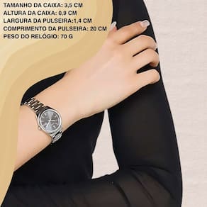 Medidas Tamanho da caixa: 3,5 cm Altura da caixa: 0,9 cm Largura da pulseira:1,4 cm Comprimento da pulseira: 20 cm Peso do relógio: 70 g