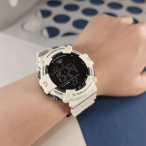 Características Formato do Relógio: Redondo Composição do Vidro: Acrílico Material da Caixa: Resina Cor da Caixa: Branco, Preto Cor do mostrador: Digital, Preto Material da Pulseira: Borracha Cor da Pulseira: Branco Mecanismo: Digital