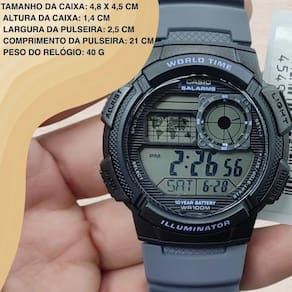 Ficha técnica Marca: Casio Modelo: AE-1000W-8AVDF Mecanismo: Digital Quartz Material da Caixa: Resina Material da Pulseira: Resina Resistência à Água: 100 m (10 ATM) Tipo de Vidro: Resina / Esférico Formato: Redondo Gênero: Masculino Estilo: Esportivo / Militar Funções: Hora Mundial (48 cidades), 5 Alarmes Diários, Cronômetro 1/100 s, Temporizador 24 h, Iluminação LED, Calendário Automático (até 2099), Formatos 12/24 h, Precisão ±30 s/mês.