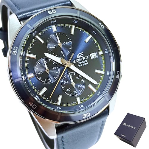 Marca: Casio Modelo: EFR-526L-2CVUDF Tipo de relógio: Analógico Gênero: Masculino Cor da caixa: Prateado Cor da pulseira: Azul Petróleo Estilo: Casual Alarme: Não Cronógrafo: Sim Calendário: Sim Luz: Não – ponteiros fluorescentes Resistência à água: Sim – 10 ATM = 100 metros Tipo de fecho: Fivela Simples Material da caixa: Aço Inoxidável Material da pulseira: Couro Características do vidro: Cristal Mineral Tamanho da caixa: 44 mm Espessura da caixa: 12 mm Comprimento da pulseira: 24 cm Largura da pulseira: 20 mm Tampa do fundo: Rosqueado Peso: 75 Gramas Alimentação: Bateria Garantia do Fabricante: 12 meses Fabricante: Casio