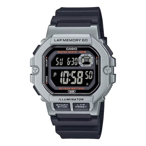 Iluminação LED Hora dupla Temporizador Cronômetro de 1/100 de segundo 3 Alarmes multifuncionais Calendário automático completo (até o ano de 2099) Formato 12/24 horas Horário regular: Hora, minutos, segundo, pm, mês, data, dia Precisão: ±30 segundos por mês Duração aprox. da pilha: 10 anos Resistência à água : 10 atm / Este relógio é classificado como resistente à água ou pressão de 10 ATM.