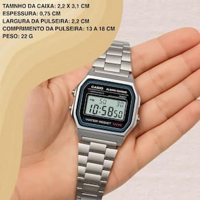 Ficha Técnica Marca: Casio Modelo: A158WA-1DF Movimento: Digital Material da Caixa: Resina cromada Material da Pulseira: Aço inoxidável Resistência à água: 3 ATM (30 metros) Formato: Quadrado Gênero: Unissex Estilo: Casual retrô Diâmetro da caixa: 3,7 x 3,3 cm Espessura: 0,8 cm Largura da pulseira: 1,8 cm Comprimento da pulseira: 20 cm Peso: 46 g