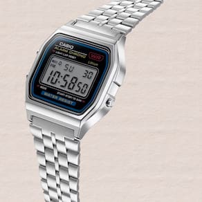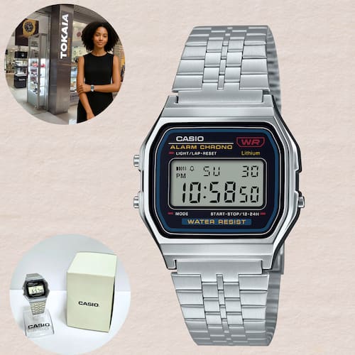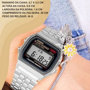 Um ícone atemporal, o Casio A159WA é o acessório ideal para quem combina elegância e praticidade em cada segundo. Seu design vintage em prata com caixa retangular e pulseira de aço inoxidável ajustável oferece conforto e sofisticação em qualquer ocasião. O visor digital apresenta horas, minutos, segundos, dia e data, com iluminação LED para visualização em ambientes com pouca luz. Equipado com cronômetro, alarme e calendário automático, este modelo une charme retrô à eficiência moderna. Leve, versátil e durável, é perfeito para o uso diário, garantindo estilo e pontualidade em todos os momentos.