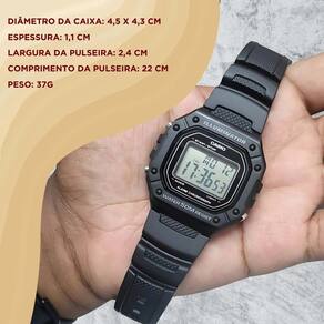 Ficha técnica: Marca: Casio Modelo: W-218H Movimento: Digital Material da Caixa: Resina Material da Pulseira: Resina Resistência à água: 5 ATM (50 metros) Formato: Retangular Gênero: Unissex Estilo: Esportivo Diâmetro da caixa (cm): 4,5 x 4,3 Espessura (cm): 1,1 Largura da pulseira (cm): 2,4 Comprimento da pulseira (cm): 22 Peso (g): 37