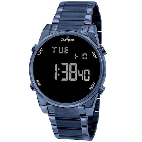 Características Formato do Relógio: Redondo Composição do Vidro: Cristal mineral Material da Caixa: Aço Inox Cor da Caixa: Azul Cor do mostrador: Digital Material da Pulseira: Aço Inox Cor da Pulseira: Azul Mecanismo: Digital