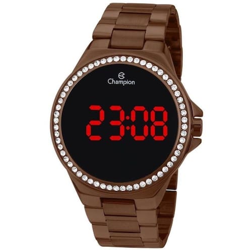 Possui mecanismo digital, a pulseira é na cor chocolate, fabricada em metal, com 23 cm de comprimento e possui fecho dobrável com dois botões. A caixa (peça onde fica o mostrador) é fabricada em metal, mede 4,2 cm de diâmetro, sem considerar a coroa, e 1,5 cm de espessura, o que é considerado tamanho grande. O relógio champion digital ch40151r tem nível de resistência à água especificado em 5 atm. Com relação as funções adicionais do relógio: possui calendário digital e luz de led. É fabricado por magnum industria da amazônia s/a. Cnpj: 63.715.510/0001-65 e tem garantia de 1 ano com o fornecedor.