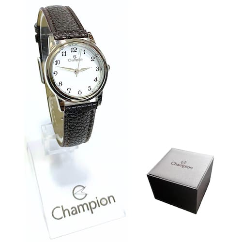 Marca: Champion Modelo: CH25007Q Tipo de relógio: Analógico Gênero: Feminino Cor da caixa: Prateado Cor da pulseira: Marrom Estilo: Casual Alarme: Não Cronômetro: Não Calendário: Não Luz: Não Resistência à água: Sim – 5 ATM = 50 metros Tipo de fecho: Fivela simples Material da caixa: Aço Material da pulseira: Couro Características do vidro: Cristal Mineral Tamanho da caixa: 25 mm Espessura da caixa: 9 mm Comprimento da pulseira: 20 cm Largura da pulseira: 13 mm Tampa do fundo: Rosqueado Peso: 22 Gramas Alimentação: Bateria Garantia do Fabricante: 12 meses Fabricante: Magnum Indústria da Amazônia S/A