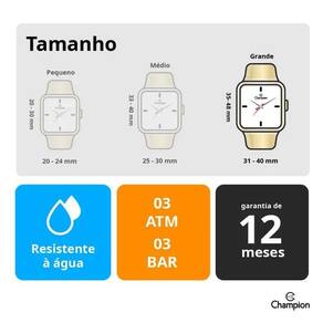 Relógio Feminino Champion CN21318Q Características: Caixa Formato Quadrado Caixa Largura 34 mm Caixa Espessura 9 mm Caixa Comprimento 34 mm Caixa Material Metal Caixa Cor Prata Mostrador Cor Branco Pulseira Comprimento 170 mm Pulseira Material Aço Pulseira Cor Prata Fecho Tipo Carrinho Estilo Social Mecanismo Analógico 12 Meses Marca: Não Informado