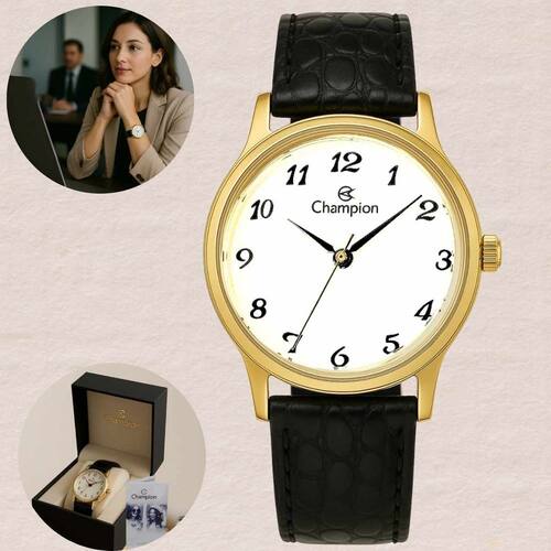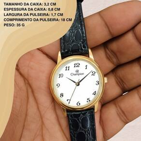 Marca: Champion Modelo: CN28008B Gênero: Feminino Formato: Redondo Mostrador: Analógico Quartz Material da Caixa: Metal Cor da Caixa: Dourado Cor do Mostrador: Branco Vidro: Cristal mineral Pulseira: Couro preto Fecho: Fivela Resistência à Água: 50M (5 ATM)