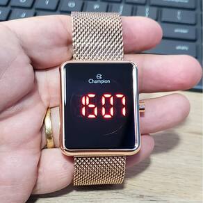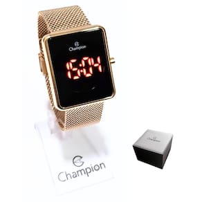 Marca: Champion Modelo: CH40080P Tipo de relógio: Digital Gênero: Feminino Cor da caixa: Dourado Cor da pulseira: Dourado Estilo: Casual Alarme: Não Cronômetro: Não Calendário: Sim Luz: Sim Resistência à água: Sim – 3 ATM = 30 metros Tipo de fecho: Fivela de gancho Material da Caixa: Aço Inoxidável Material da Pulseira: Mesh de Aço Inoxidável Características do vidro: Vidro Mineral Tamanho da caixa: 43 mm Espessura da caixa: 10 mm Comprimento da pulseira: 23 cm Largura da pulseira: 23 mm Tampa do fundo: Rosqueado Peso: 122 Gramas Alimentação: Bateria Garantia do Fabricante: 12 meses Fabricante: Magnum Indústria da Amazônia S/A
