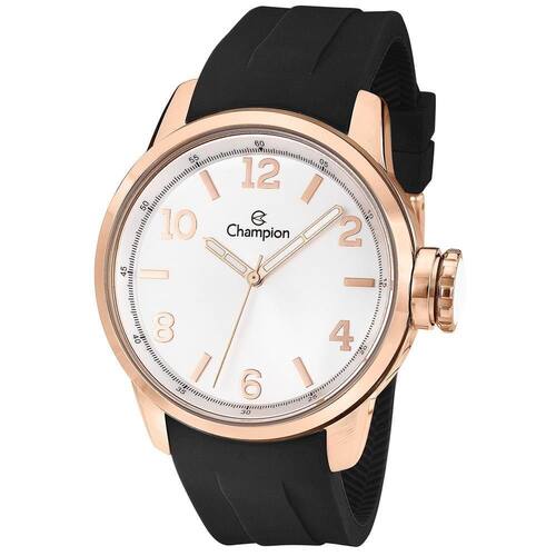 Caixa Em Metal Pulseira Em Silicone Preto Vidro de Cristal Mineral Fundo Rosqueado Resistente à Água 5 Atm Diâmetro / Largura da Caixa: 44.00 MM Funções: Analógico Mostrador Prateado com Números e Detalhes em Rosé Alimentação do Maquinário Bateria