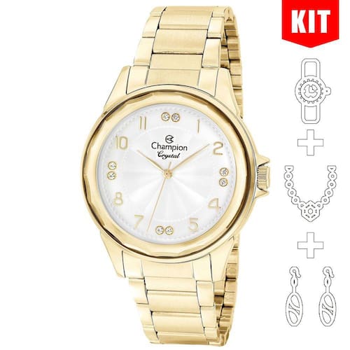 Características Formato do Relógio: Redondo Composição do Vidro: Cristal mineral Material da Caixa: Metal Cor da Caixa: Dourado Cor do mostrador: Prata Material da Pulseira: Aço Inox Cor da Pulseira: Dourado Mecanismo: Analógico Quartz