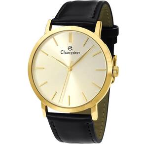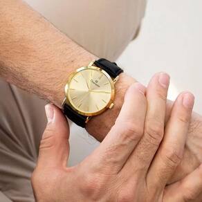 Características Formato do Relógio: Redondo Composição do Vidro: Cristal mineral Material da Caixa: Metal Cor da Caixa: Dourado Cor do mostrador: Dourado Material da Pulseira: Couro Cor da Pulseira: Preto Mecanismo: Analógico Quartz