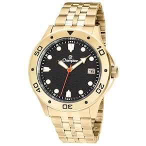 Características Formato do Relógio: Redondo Composição do Vidro: Cristal Mineral Material da Caixa: Aço Inox Cor da Caixa: Dourado Cor do mostrador: Preto Material da Pulseira: Aço Inox Cor da Pulseira: Dourado Mecanismo: Analógico Quartz