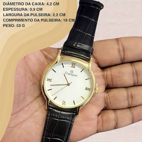 Ficha Técnica: Marca: Champion Modelo: CN20006B Movimento: Quartzo Material da Caixa: Aço Inoxidável Dourado Material da Pulseira: Couro Resistência à água: 5 ATM (50 metros) Formato: Redondo Gênero: Masculino Estilo: Casual/Clássico Diâmetro da caixa: 4,2 cm Espessura: 0,9 cm Largura da pulseira: 2,2 cm Comprimento da pulseira: 19 cm Peso: 53 g
