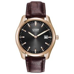 Relógio masculino clássico Citizen com pulseira de couro Eco-Drive, data, ponteiros e marcadores luminosos, mostrador preto, pulseira marrom/ouro rosa