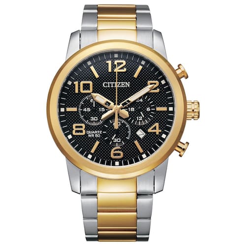 - O quartzo da Citizen tem uma pulseira de aço inoxidável de dois tons, com uma face preta com todos os marcadores aplicados. Recursos avançados incluem a exibição de formatos de tempo de 12 e 24 horas, um cronógrafo e a data.
