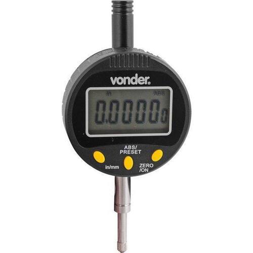 Ref.: do Fornecedor:3595100010Marca:VonderConteúdo da Embalagem:1 Relógio comparador digitalDestaques e diferenciais:Possui sistema liga/desliga, zeragem em qualquer posição, conversão de unidade mm/polegada e desligamento automático após 5 minutosAplicações e dicas de uso:Indicado para medições de paralelismo, centragem, planicidade e dimensões de peças e dispositivosCaracterísticas Técnicas:Capacidade do relógio comparador digital: 0,01 mm - 12,7 mm Resolução do relógio comparador digital: 0,001 mm Exatidão do relógio comparador: 0,004 Altura total do relógio comparador digital: 121,0 mm Espessura total do relógio comparador digital: 32,0 mm Alimentação: Bateria CR-2032 Ean: 7893946581794