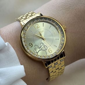Seu mostrador analógico proporciona leitura clara das horas, enquanto o movimento quartzo garante precisão e confiabilidade no funcionamento. A caixa em metal dourado combinada com a pulseira em aço dourado oferece durabilidade e um visual refinado, tornando o relógio uma peça versátil para o uso diário ou para momentos especiais.