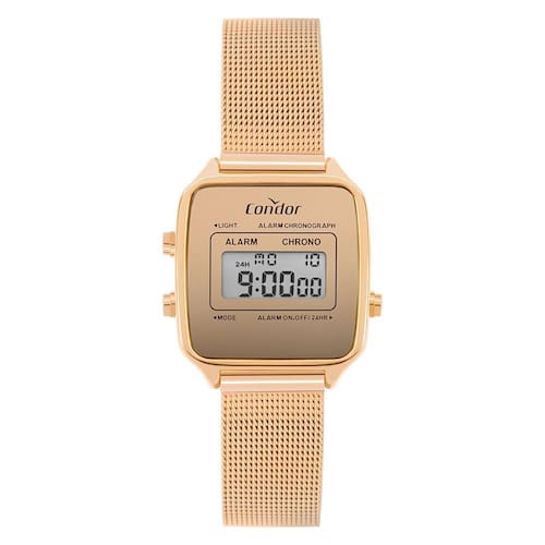 Com caixa quadrada de 26 mm, o mostrador digital oferece funções essenciais como alarme, cronômetro e calendário, tudo em um display nítido e fácil de visualizar. A pulseira em aço tipo mesh na cor rosé proporciona conforto e encaixe perfeito ao pulso, além de reforçar a sofisticação característica dos modelos Condor.