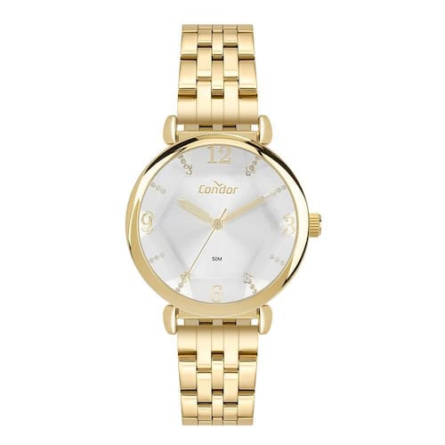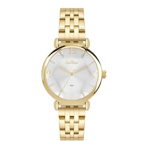 Relógio Condor Feminino Dourado com Detalhes em Cristal - 33mm O modelo Condor CO2035NJQ/4K é uma peça que une sofisticação e delicadeza em cada detalhe. Ideal para mulheres que valorizam um visual elegante, esse relógio é perfeito para o dia a dia ou para ocasiões especiais. Com caixa de 33mm em metal e pulseira de aço dourada, o destaque fica por conta do mostrador prateado com acabamento em efeito raio de sol e aplicação de cristais nos marcadores de hora, garantindo um toque de brilho e glamour sem exageros. O design refinado da pulseira com elos duplos oferece conforto ao pulso e reforça o estilo atemporal da peça. Além disso, o relógio possui resistência à água de até 50 metros, combinando beleza com funcionalidade. Especificações Técnicas: Marca: Condor Modelo: CO2035NJQ/4K Gênero: Feminino Tamanho da Caixa: 33 mm Material da Caixa: Metal Material da Pulseira: Aço Cor da Caixa: Dourada Cor da Pulseira: Dourada Cor do Mostrador: Prata com cristais Tipo de Vidro: Cristal Mineral Resistência à Água: 5 ATM (50 metros) Mecanismo: Analógico Alimentação: Bateria Conteúdo da Embalagem: 1 Relógio Condor Feminino Manual de instruções Certificado de garantia Estojo da marca Garantia: 1 ano contra defeitos de fabricação (fornecida pelo fabricante)