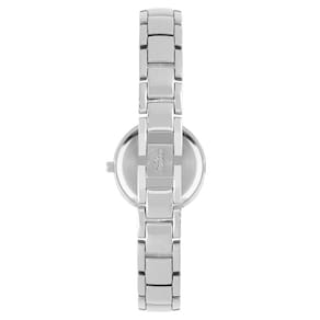 A caixa de 30mm em metal prateado confere delicadeza ao modelo, enquanto o mostrador prata com detalhes em dourado acrescenta sofisticação e contraste sutil. Os marcadores numéricos destacados e os índices com aplicação de pedras trazem um toque de brilho discreto, que valoriza ainda mais o visual feminino.
