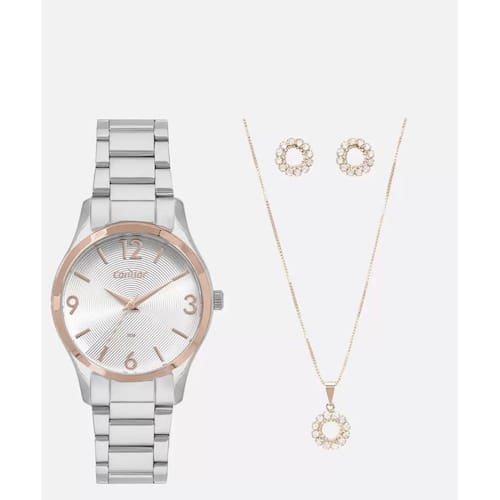 Relógio Feminino Condor COPC21AECVK3K Relógio feminino com sistema analógico com ponteiros indicando as horas, minutos e segundos. Caixa em metal com vidro em cristal mineral e pino para ajuste de horas. Mostrador personalizado com indicadores tracejados e numéricos. Pulseira em aço trabalhado com fechamento por botão lateral. - Acompanha colar, par de brincos ou pusleira berloque. Resiste à água: 30ATM Composição do Vidro: cristal mineral Material da Caixa: metal Material da Pulseira: aço Medidas aproximadas: - Largura da caixa, incluindo pino: 3,6cm - Espessura da caixa: 1cm - Comprimento da pulseira: 17cm Informações Adicionais: Tamanho: único Cor: prateado Modelo: Kit Relógio Feminino Condor COPC21AECVK3K Material: aço Detalhes adicionais: kit, fashion Marca: Condor - Acompanha estojo com 1 Relógio, 1 Manual de instruções e Certificado de garantia.