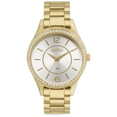 Relógio Condor Feminino Ref: Co2035nac/4k Casual Dourado DESCRIÇÃO DO PRODUTO: Caixa de Metal Pulseira de Aço Vidro de Cristal Mineral Fundo Pressão Resistente à Água 5 Atm Diâmetro / Largura da Caixa: 40.00 MM Alimentação do Maquinário: Bateria Maquina Japonesa Mostrador prateado com numeros Aro externo de pedras de 1 Ano