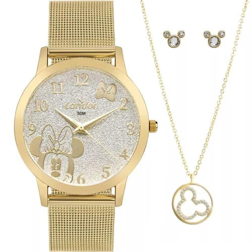 Relógio condor feminino ref: co2035ngi/k4k dourado minnie + semijoia Descrição do produto: Caixa de metal Pulseira de malha de aço mesh Vidro de cristal mineral Fundo pressão Resistente à água 5 atm Diâmetro / largura da caixa: 36.00 mm Alimentação do maquinário: bateria Maquina japonesa Mostrador prateado brilhante com numeros e detalhes da personagem minnie mouse + par de brinco, corrente e pingente semijóia Produto oficial licenciado disney de 1 ano Marca: Não Informado Ean: 7891530845666