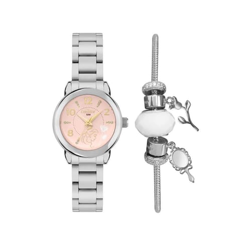 Relógio condor feminino ref: co2035nmy/k4j prateado bela e a fera + semijoia Descrição do produto: Caixa de metal Pulseira de aço Vidro de cristal mineral Fundo pressão Resistente à água 5 atm Diâmetro / largura da caixa: 25.00 mm Alimentação do maquinário: bateria Maquina japonesa Mostrador rosa claro com numeros, pedras e detalhes da personagem bela da animeção a bela e a fera + pulseira e berloques semijóia Produto oficial licenciado disney de 1 ano